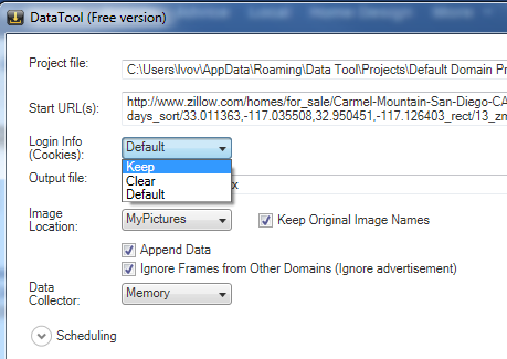 The sign-in is done manually only once before you start the Project Designer to build the project. That creates an authentication cookie in the browser. Then the project Cookies policy should be set to “Keep” using Project Properties screen. That instructs the crawler to keep and restore the current authentication cookie each time the program starts collecting data. Restoring the authentication cookies is a simple approach that works well for web sites that use persistent cookies (i.e. Amazon.com). It can be used for scheduled tasks.